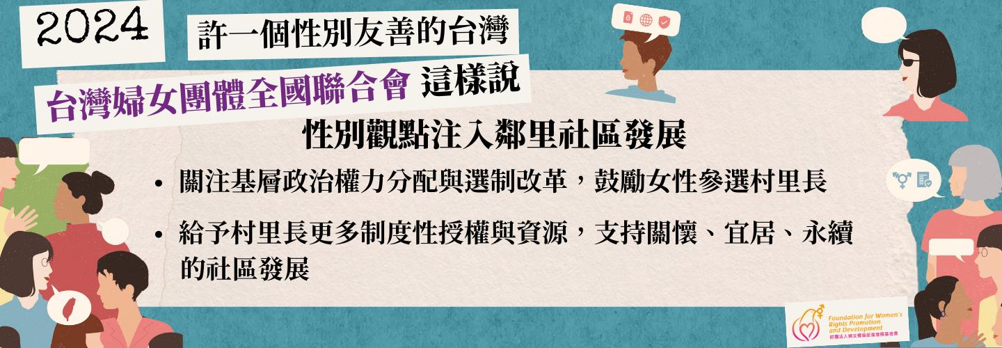 即使是層次高如總統的參選人,也應認知台灣社會的進步與共好,需要有基層同行、在基層落實。因此,台灣婦女團體全國聯合會主張將性別觀點帶到村里社區,並給予相應的制度與政策支持,這不僅攸關婦女權益的提升,也將帶給全民更為宜居、關懷、永續的生活環境,以下說明這兩個重點。