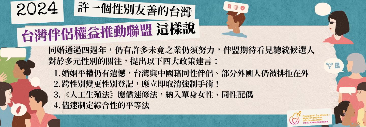 2019年5月24日,台灣通過同婚法案,4年多過去了,性別平等仍有許多未竟之業,包括兩岸同婚、性別變更登記、人工生殖、跨性別人權、平等法等議題需要努力。伴盟期待在總統大選中,看見各候選人對於多元性別的關注,以下說明四大政策建言。